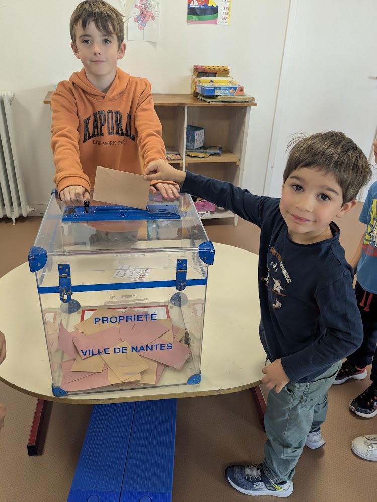 Jeudi 16 octobre Après une semaine de campagne électorale, les classes par binôme ont élu leurs délégués jeudi ! La salle de motricité a été transformée en bureau de vote avec le vrai matériel prêté par la mairie. Voici les résultats : En PS = Délégués: Charlotte et Maxence / Suppléants: Charlie et Adam En
