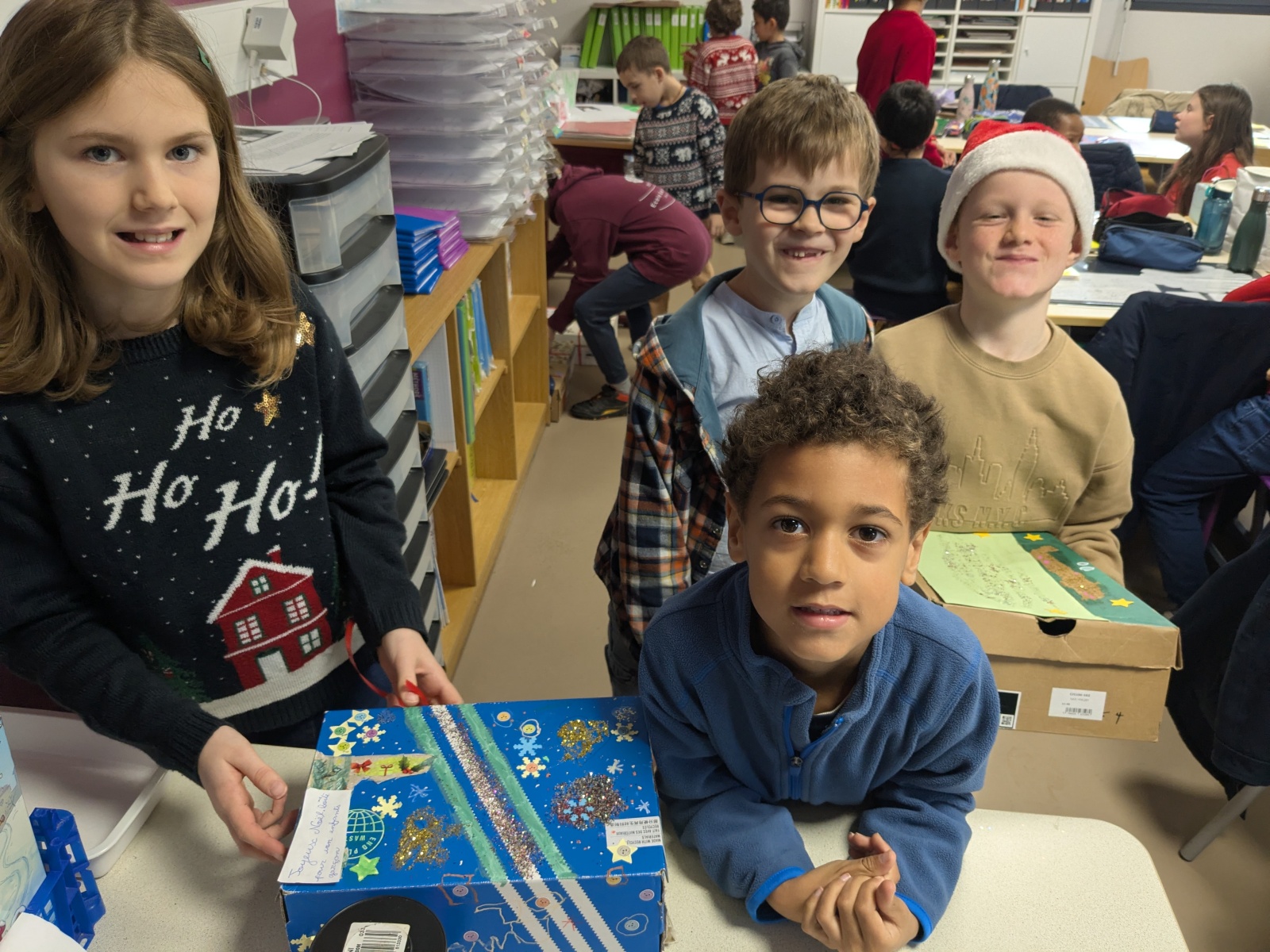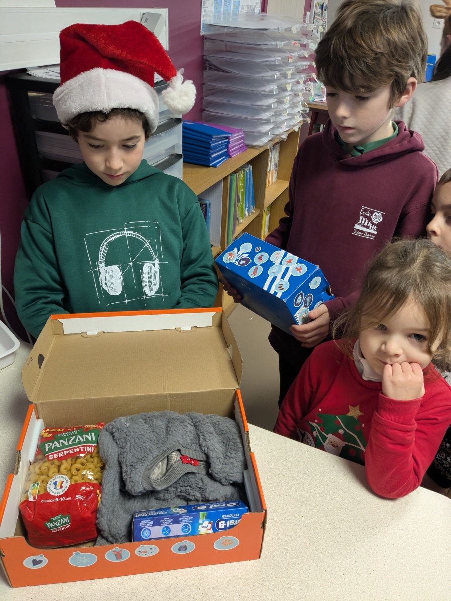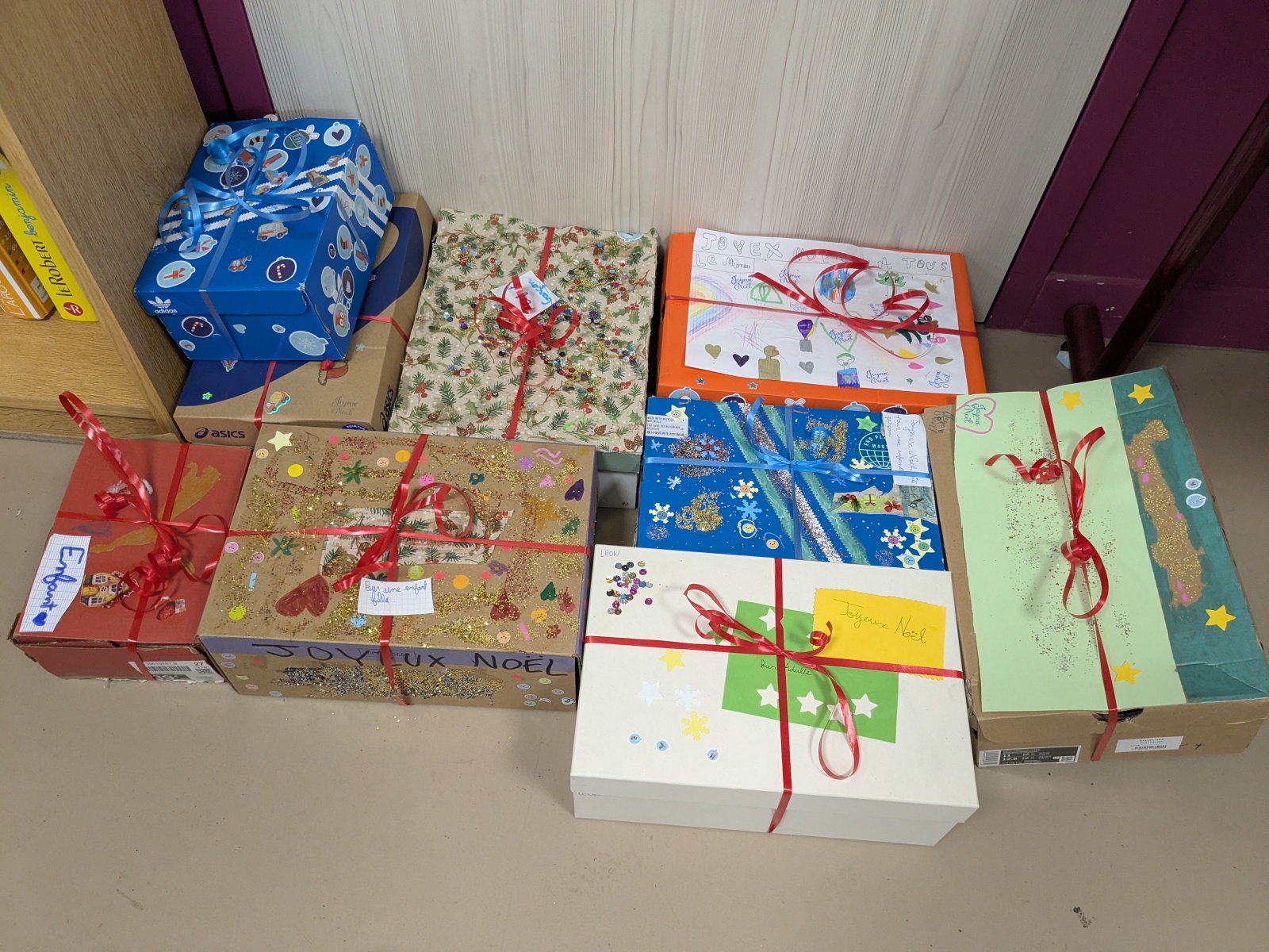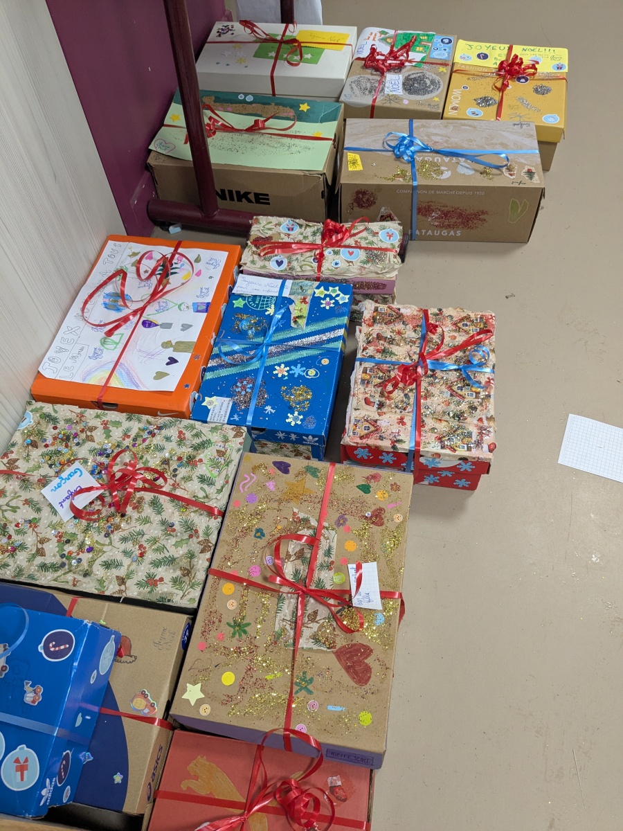L’objectif était de réaliser des boîtes (boîtes à chaussures remplies de dons divers : aliments, jeux, vêtements, livres etc…) à offrir à des personnes fragiles et démunies par le biais des Restau du coeur.